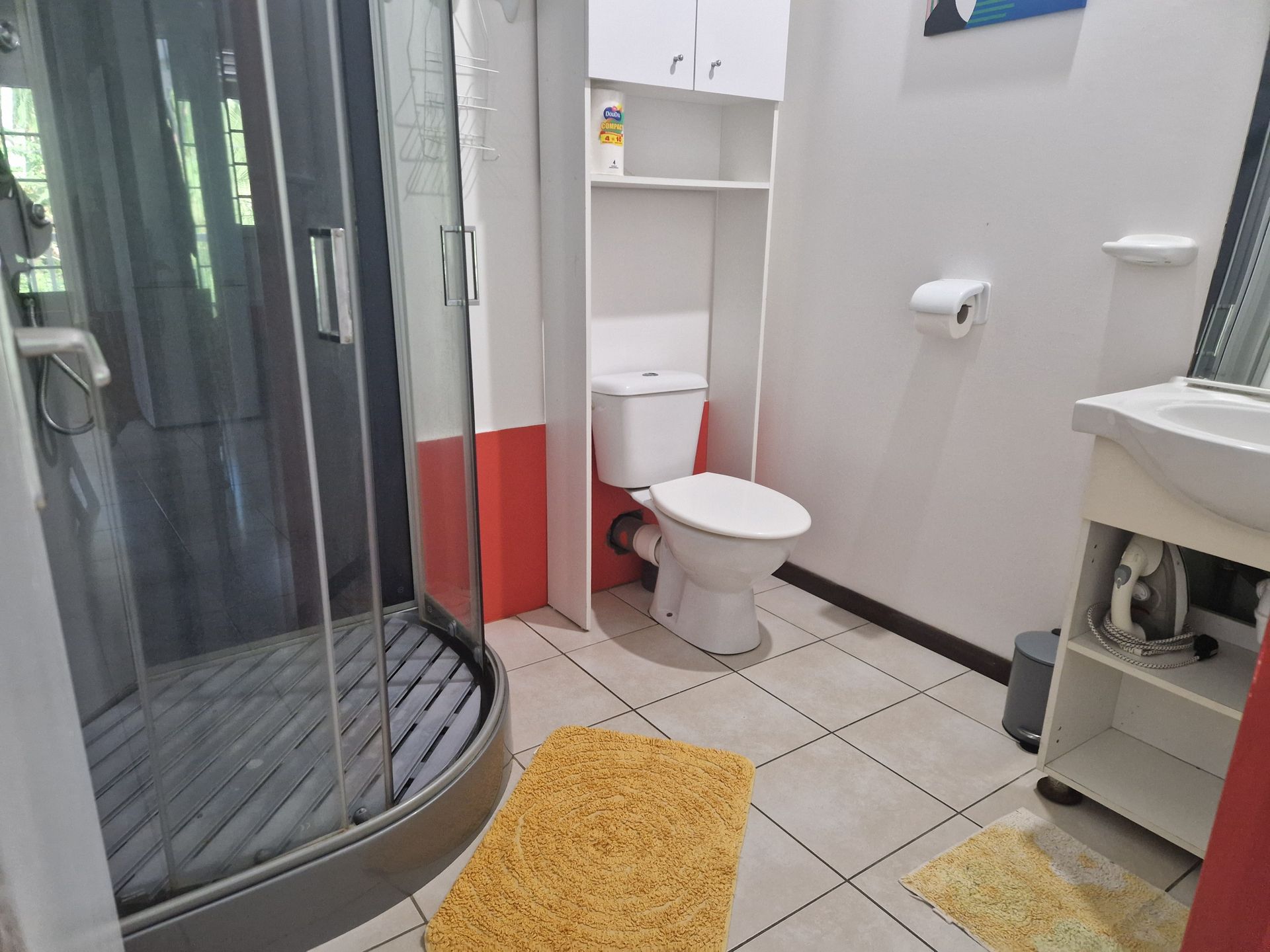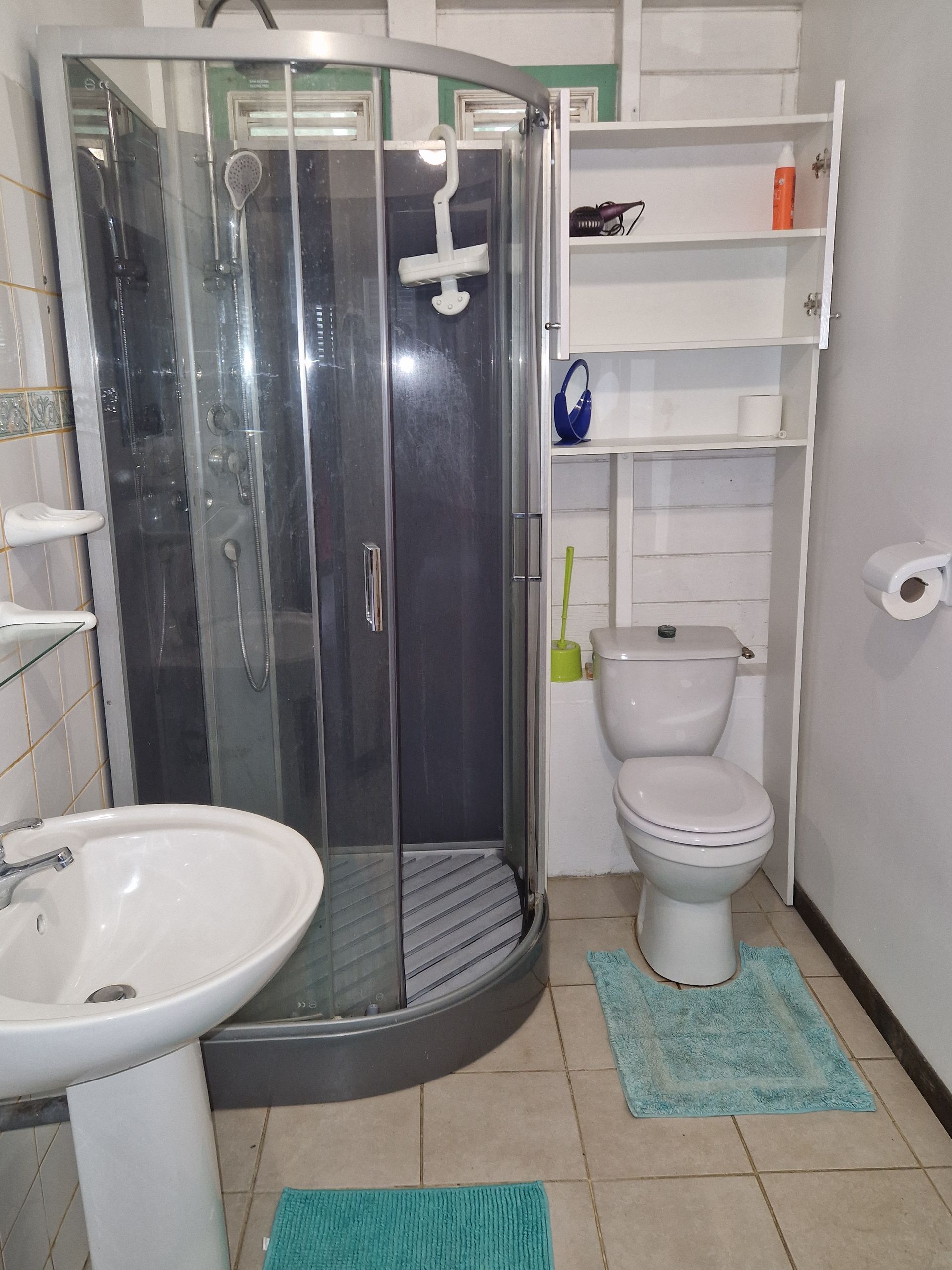 - Une salle de bain équipée d'une cabine de douche, lavabo, WC.