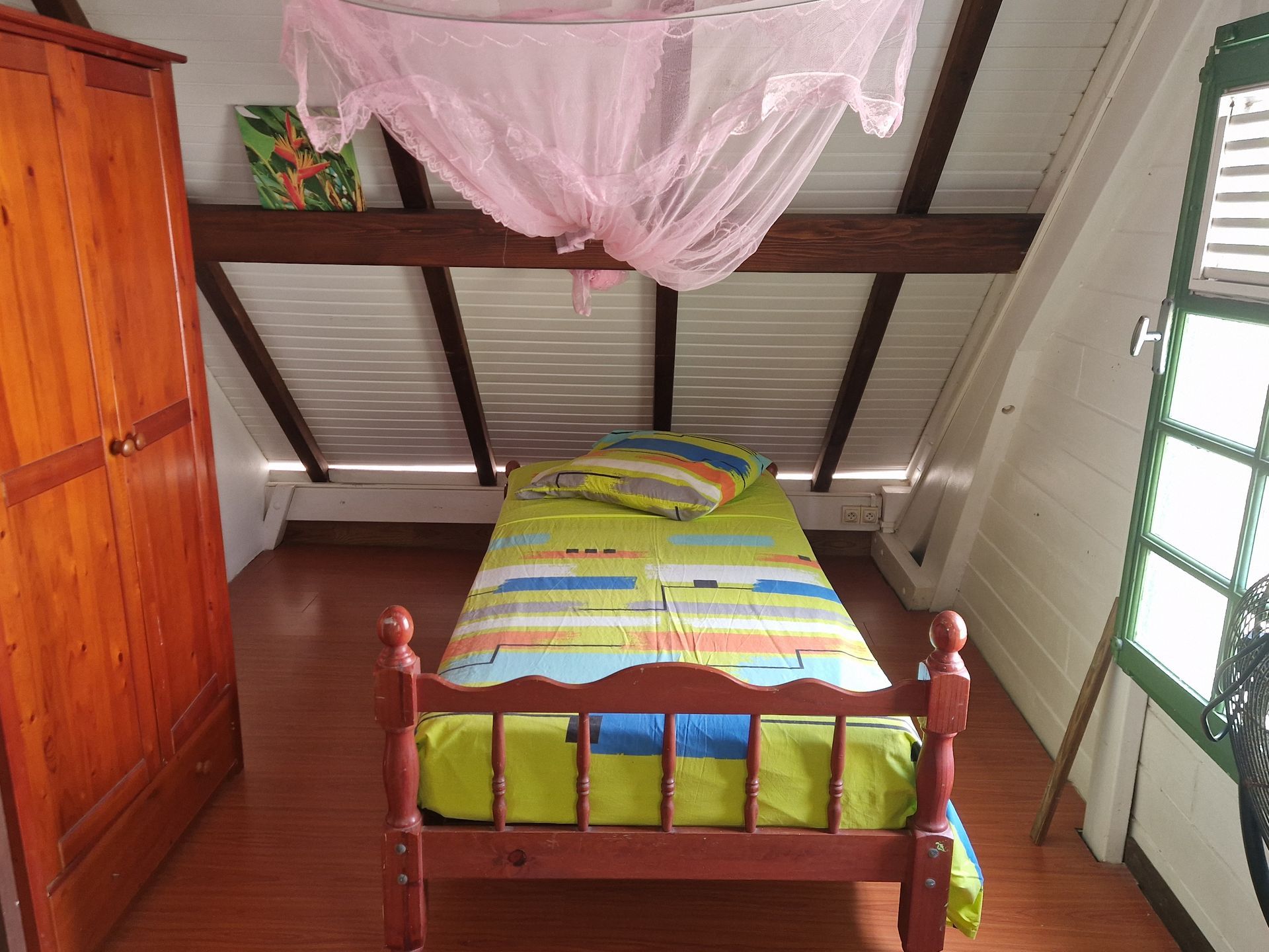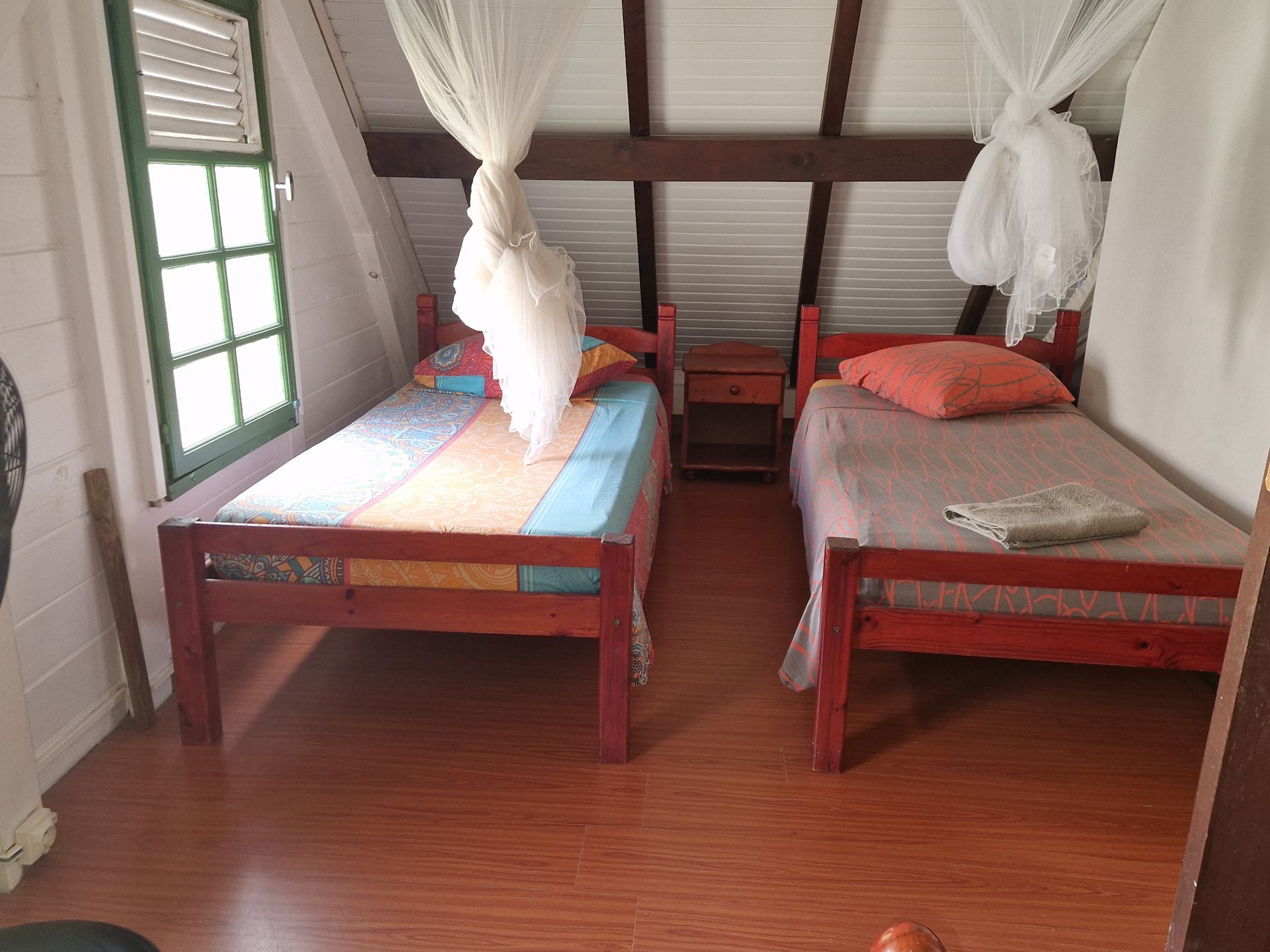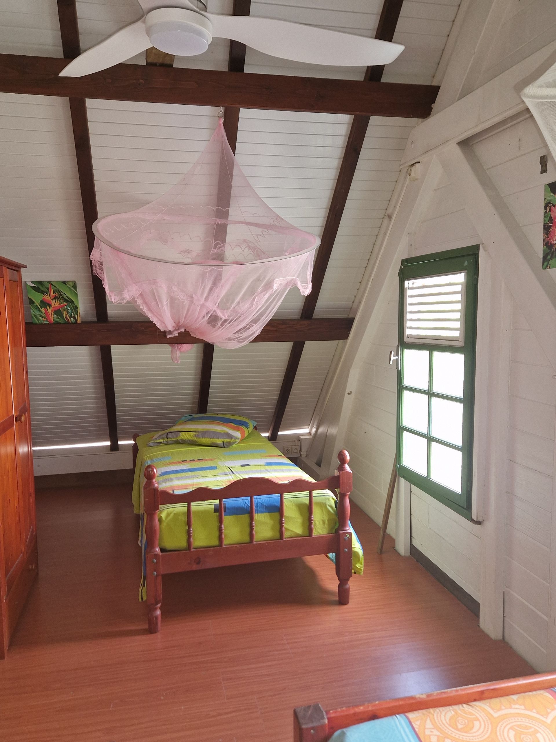 - La deuxième, dans la mézanine, climatisée également, plus petite est équipée de trois lits simples, d'un chevet, d'une armoire et trois moustiquaires.